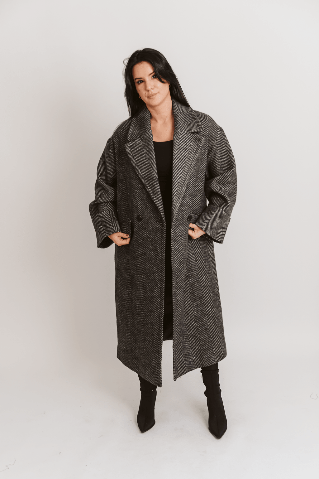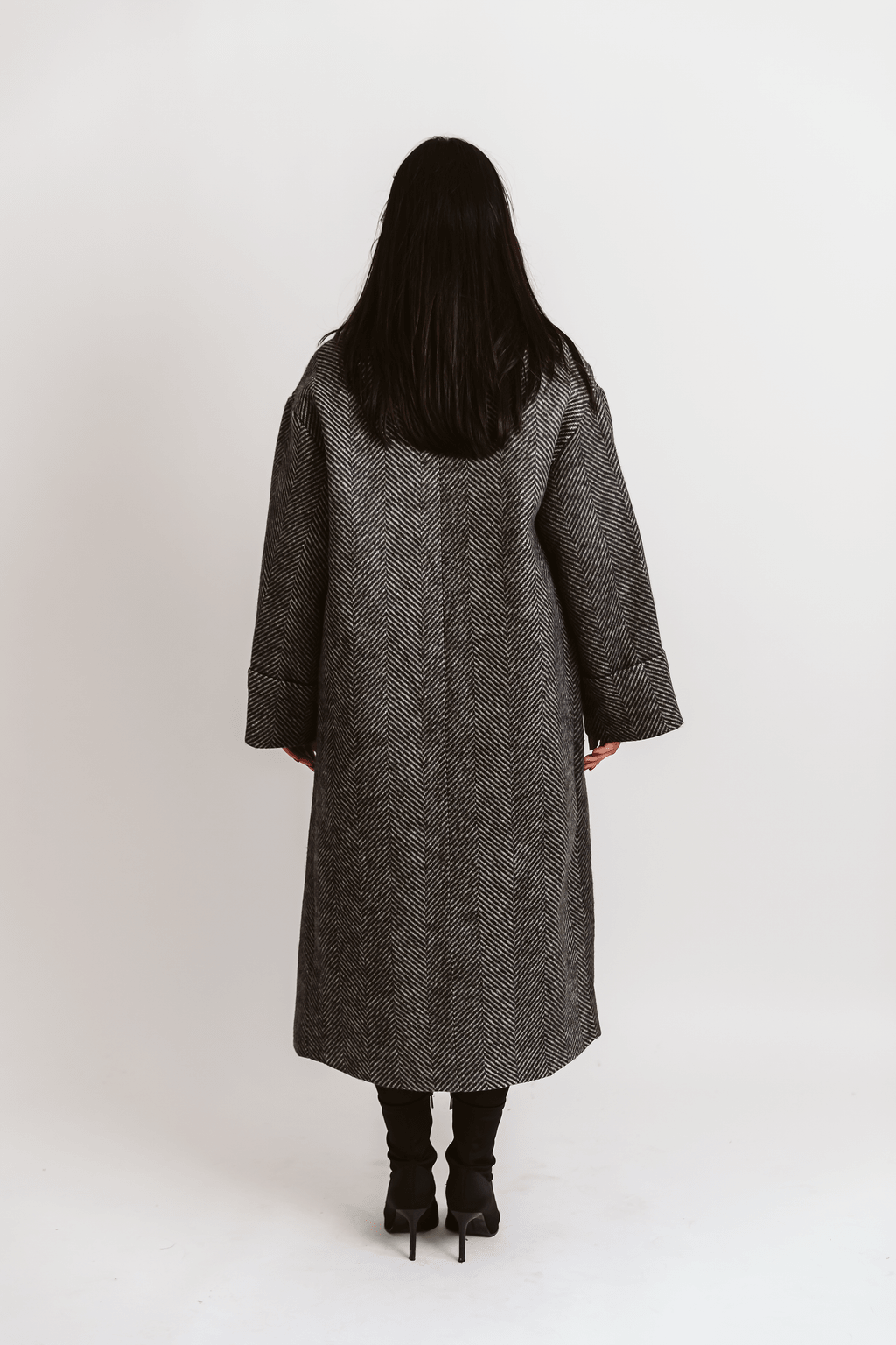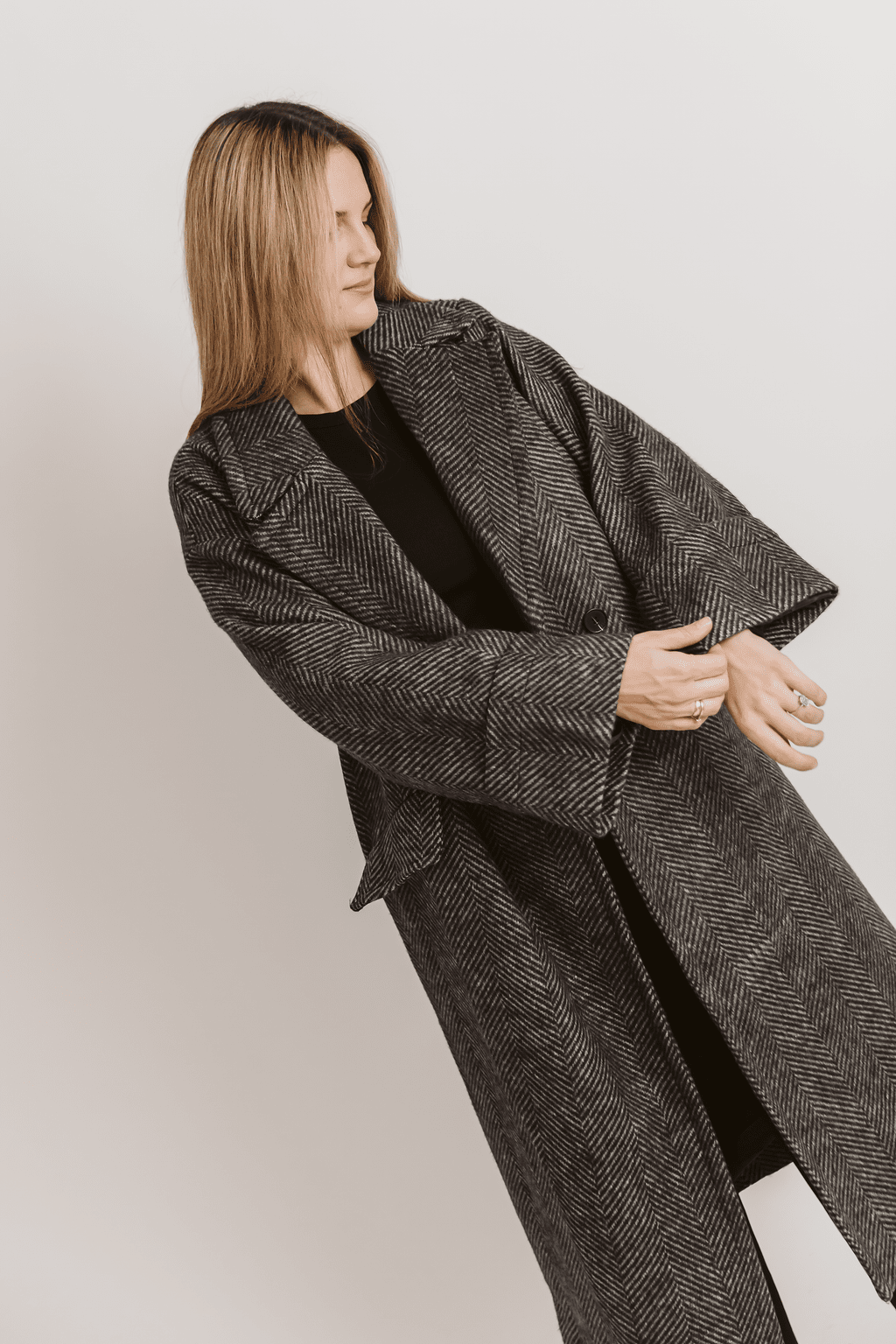 Ten płaszcz to esencja ponadczasowego stylu, idealna dla kobiety, która ceni elegancję bez wysiłku. Długi, luźny krój typu oversize w subtelny wzór jodełki to kwintesencja miejskiego szyku. Zaprojektowany, by otulać komfortem i dodawać pewności siebie, sprawi, że każda stylizacja nabierze wyjątkowego charakteru. Dostępny w dwóch klasycznych wersjach kolorystycznych: czarnej i szarej, pozwoli Ci stworzyć look, który nigdy nie wyjdzie z mody.