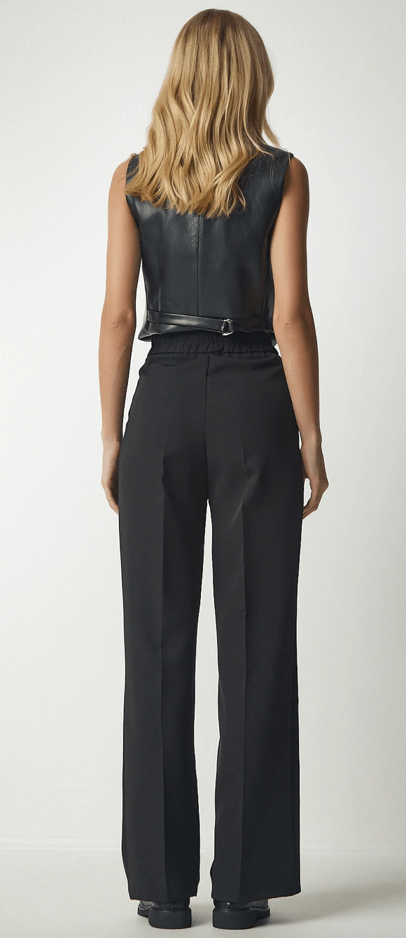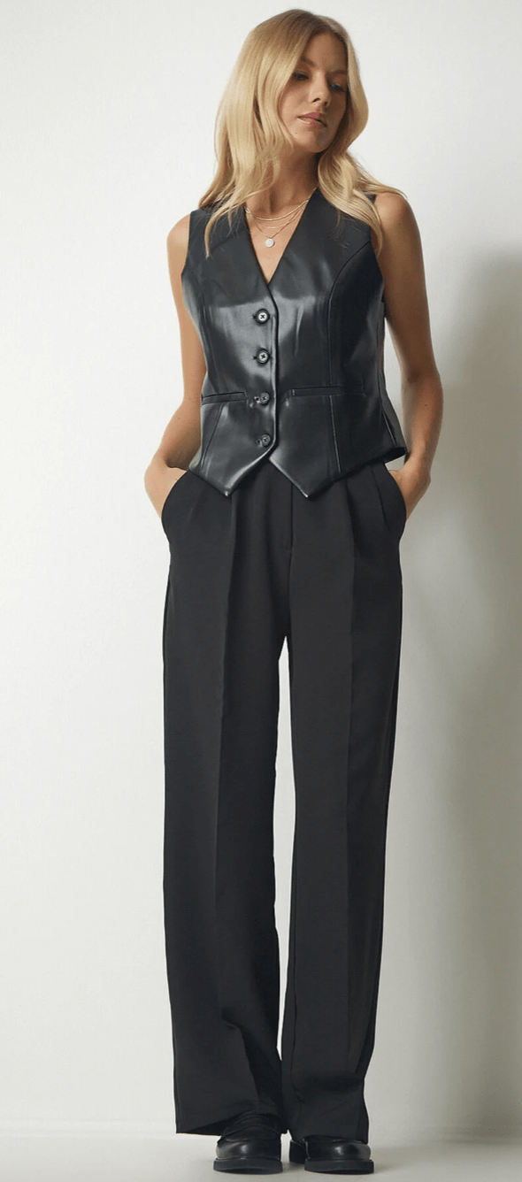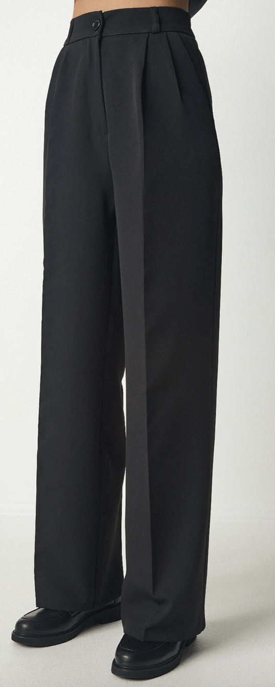 Luźne spodnie damskie w kolorze czarnym, zapinane na guzik. Wygodne o ponadczasowym kroju. Z kieszeniami.