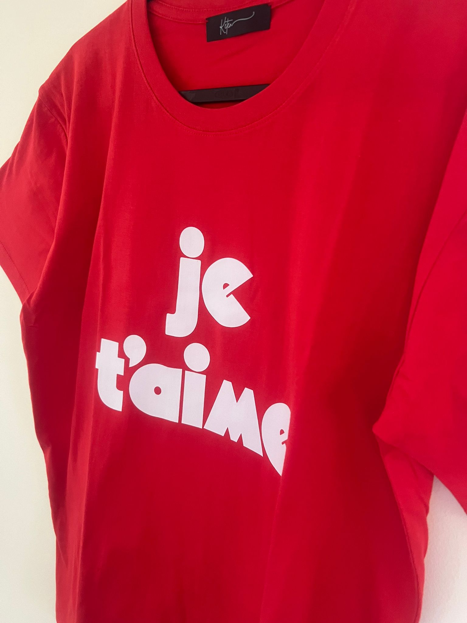 Elegancka bawełniana koszulka damska w kolorze czerwonym z romantycznym napisem "Je T'aime". Wykonana w 100% z miękkiej bawełny dla najwyższego komfortu. Idealna na co dzień, randkę czy prezent.