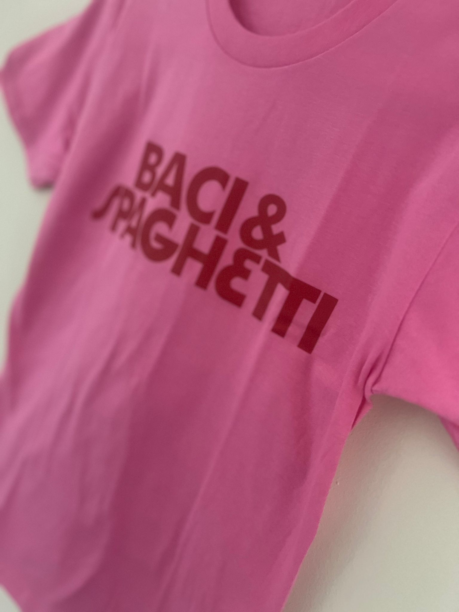 Bawełniany T-shirt różowy z napisem "Baci & Spaghetti"