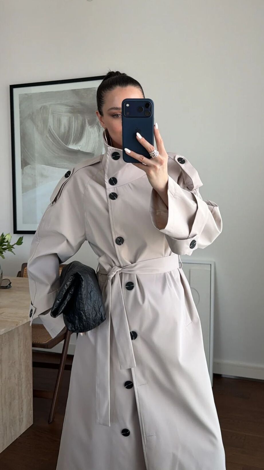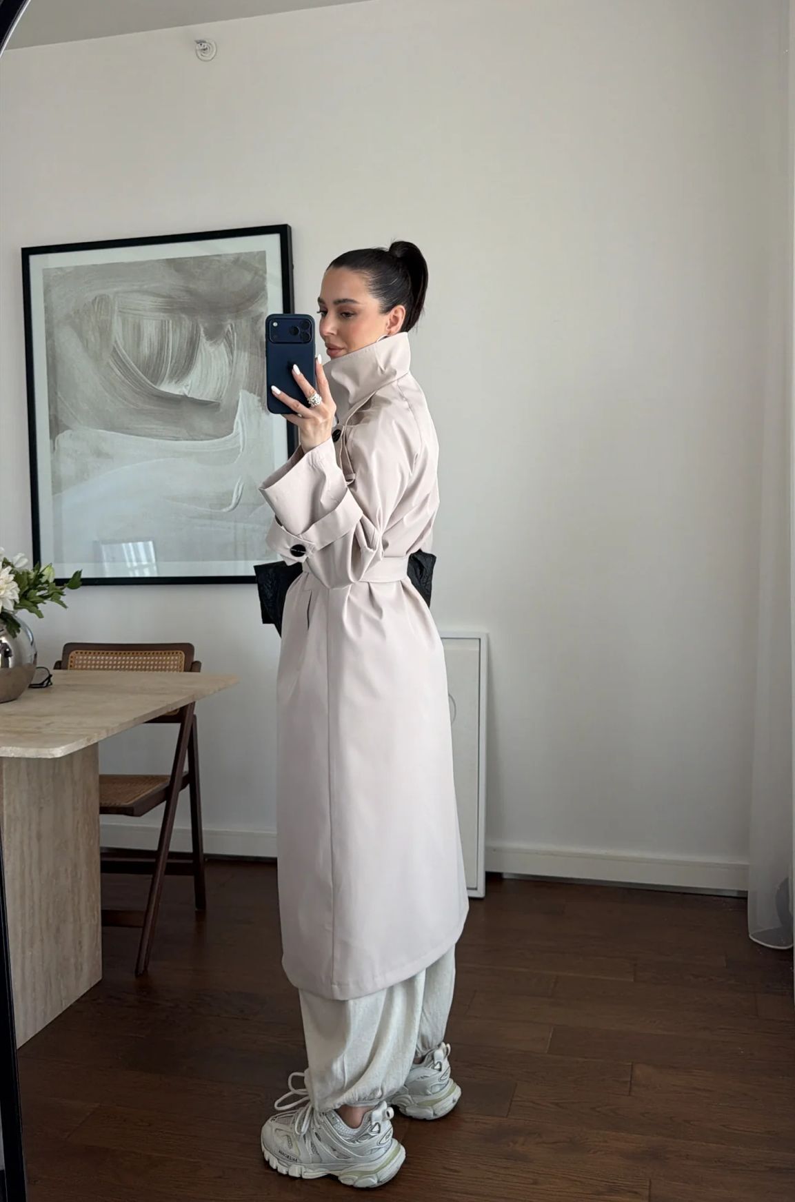 Elegancki i ponadczasowy trencz wykonany w 100% z wysokiej jakości bawełny to idealna propozycja na sezon przejściowy. Klasyczny krój w odcieniu subtelnego „kamienia” doskonale wpisuje się w minimalistyczne, nowoczesne stylizacje.